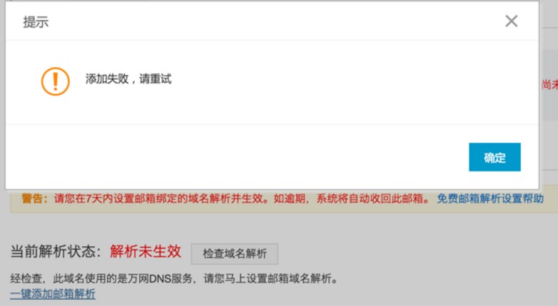 企业邮箱解析记录添加后需要做MX记录验证,如果验证不通过,请您参考: 企业邮箱解析状态显示解析未生效 。